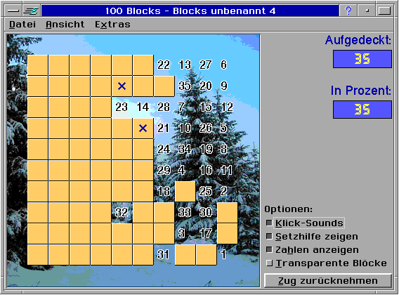 100 Blocks ist ein Strategiespiel, in dem alle 100 Felder durch Anklicken aufgedeckt werden müssen. Das Problem ist, dass man von einem aufgedeckten Feld zum nächsten nur über bestimmte Regeln kommt - anklickbare Felder sind mit einem Kreuz versehen.