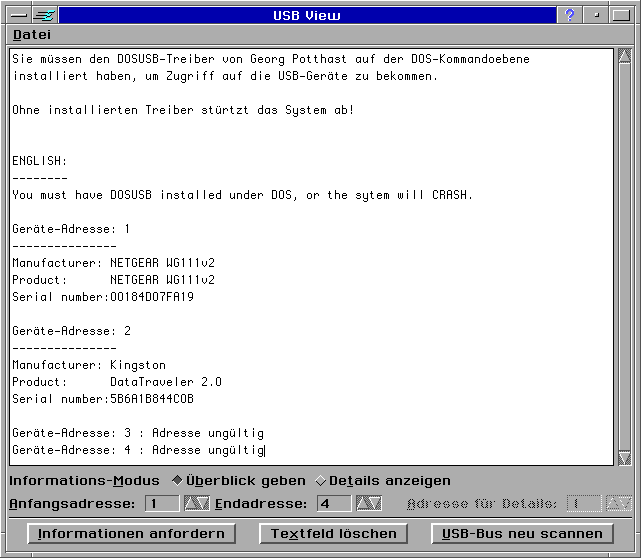 DOSUSB muss unter DOS geladen werden, entweder auf der Kommandozeile oder in der Autoexec.bat. Dabei sucht es alle angeschlossenen USB-Geräte und weist ihnen eine Nummer ("Adresse") zu, die von 1 aufwärts gezählt wird. Die Geräte können dann unter dieser Adresse ber DOSUSB angesprochen werden. Genau das macht auch USBView für GEOS.